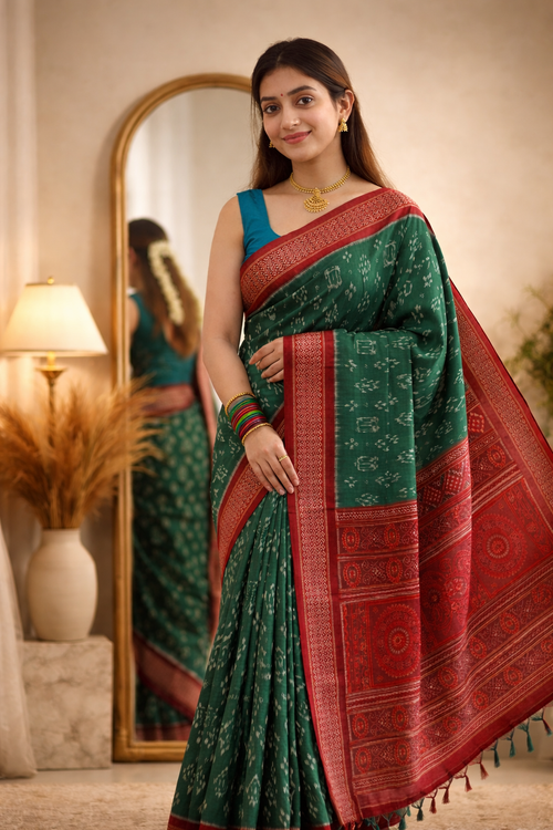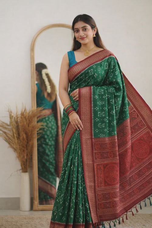 Green Sambalpuri Ikat Silk Saree with Red Border – Premium Handwoven